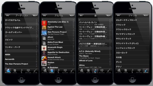 ・iPhone標準プレイヤー(ミュージック)のような選曲リスト画面(アーティスト、アルバム、曲、ジャンル、プレイリスト)を追加した